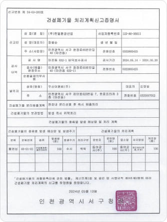 Certificate of Notification for Construction Waste Disposal Plan